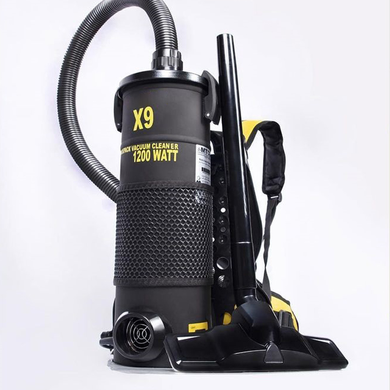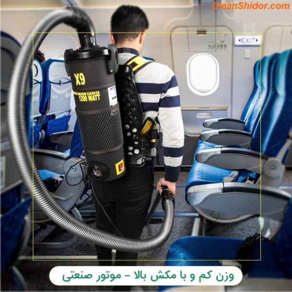 جاروبرقی کوله پشتی X9 با موتور دو پروانه صنعتی 1100وات با قابلیت حمل راحت و سبک می باشد که جهت استفاده در هواپیماها بسیار مناسب میباشد.در مکان هایی که نیاز به جابجایی بالا وجود دارد و محدودیت در حمل جاروبرقی صنعتی دارند این مدل بسیار کارایی دارد و می تواند به عنوان دمنده (فوت زن) استفاده نمود.